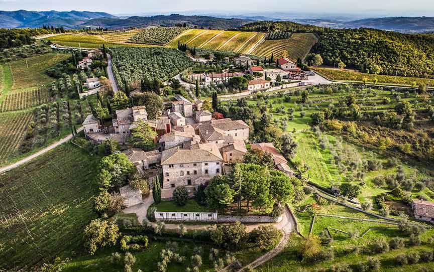 The winery, begun in 1972 as a result of the love of four families from Rome, currently comprises some 250 hectares, of which 90 are in vines and 40 in olives trees, growing at an average altitude of 480 meters. Annual production, exclusively from our estate vineyards, amounts to about 300-350,000 bottles, or some 3,500-4,000 bottles per hectare. The winery standard-bearer is “Castello di Ama,” a wine produced by a rigorous selection of sangiovese grapes from the most outstanding vineyard parcels.
